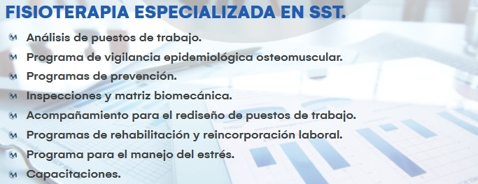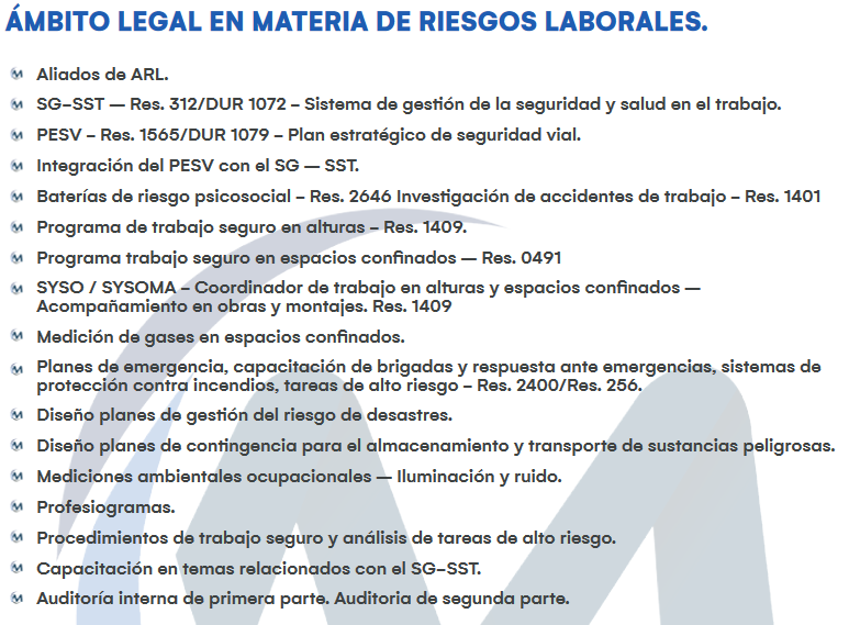 Es una empresa especialista dedicada a la prestación de servicios de asesorías, consultorías, interventorías, auditorias, capacitaciones, en el área de seguridad y salud en el trabajo para satisfacer las necesidades de todo tipo de organización.